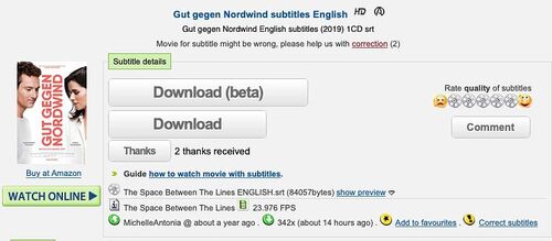 但是这两个资源都没有字幕,因为远鉴的资源是硬封,所以字幕无法提取。欧洲小语种的资源我都不看中文字幕的,因为很多都是用爱发电的,翻译一言难尽,错误百出,所以我下资源都是找带有原生英语字幕的,至少不会偏离太远。整个欧洲区没有一个好的字幕组,不像日语区,就非常靠谱。对比了一下,两个版本的资源时常一样,下一步就是找字幕了。在opensubtitles上搜了一下,正好有英语,而且和视频时间码一样,这下终于可以看了。