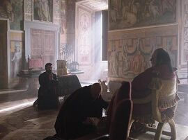 虛弱的人民陷在飢餓與病痛裡,然而無論宗教還是貴族,要的作品都是健壯的人體,要表彰的是上承古希臘的美好德性,然而當米開朗基羅待在屬於人民的無人廣場,看著自己的大衛像發呆,由於導演對細節的堅持,隔著螢幕我們可以聞到臭味,大街上的人們衣衫不整,所有濃濁髒水直接往街上潑灑,作為偉大藝術的創造者,米開朗基羅處心積慮搞到的一棟房子像豬窩一樣,裡頭茅草叢生,他還被雇主看破手腳,數落一頓,大師?他與學徒吃的是像皮鞋的麵包還有極酸臭的劣酒,他兩眼凹陷,全身都是粉塵,兩手都是厚繭。而所謂教皇,所謂貴族呢?他們也不過是在身體與言語上披上華服,開口閉口就是主的訓誡,例如不可貪婪、不可自大、不可殺人,然而在宗教的掩護下,他們幹的卻是野蠻的行為。