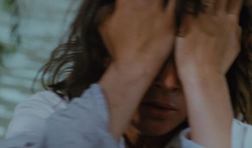但Michele最终没能等来Hans的回应。Alex颤颤巍巍地走到她跟前,在二人高低位置不等的构图中仿佛一个低头认错的孩子——对不起,让你失望了,是我。Michele接下来一系列的反应,都是这种失望的克制演绎,她放下了准备扎辫子的手,不断看向别处以回避Alex的目光,镜头选取的角度亦保证了观众无从得知二人目光是否有交汇;接着她短暂地(看似漫不经心地)扭头看向Hans,似乎在做最后的挣扎——你确定不是你吗。但为了不让这种情绪显现出来,她很快便回过头去,看向Alex,曾短暂且局部地沐浴在阳光中的脸再次隐于黯淡的阴影中。