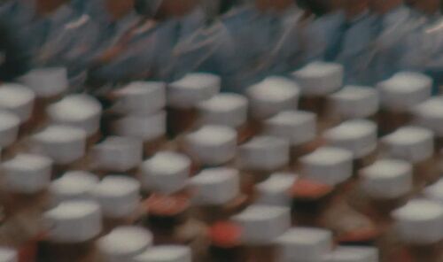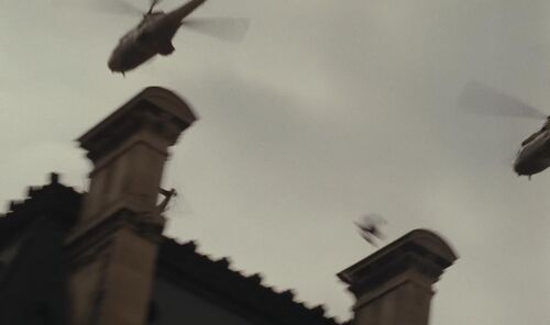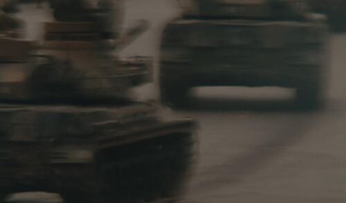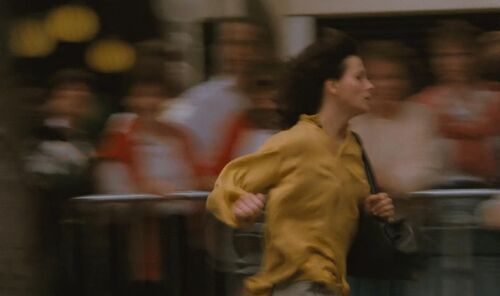 Michele从地铁站跑回新桥的一段蒙太奇中,拍摄军队行进的高速运动手持传递出一种具有强大压迫感的恐怖意味。在庞大国家机器的压迫力量下,Michele如同泅水者一般奋力挣扎。而此时响起的音乐恰恰是她不久前追寻声源的大提琴声。