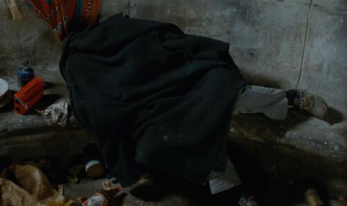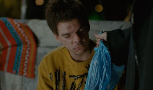 得知自己的眼疾可被医治后,Michele用安眠药灌倒了Alex。包着酒瓶的蓝色塑料袋传达出某种戏谑的意味——安眠药作为曾经唯一困扰Alex的睡眠问题的解决方案,象征着一种“自由”,睡眠的自由,外化为蓝色,但此时此刻的“自由”却并不是Alex想要的,因为它同时也意味着Michele的自由。Michele给了Alex“自由”,也给了自己自由。她脱下黑色大衣披在昏睡过去的Alex身上——她已不再服丧。