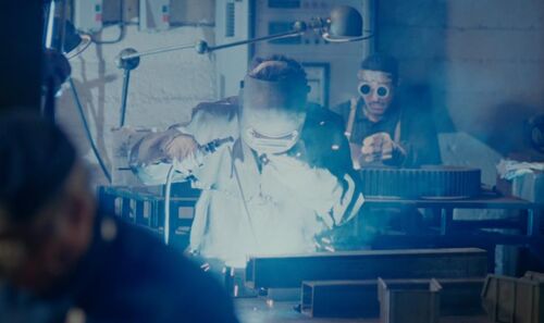一段干劲利落的蒙太奇段落交代了Alex被警察发现、殴打、审问、最后入狱的全过程,渐隐后的时间来到了两年后,画面被电焊机释放出的蓝光所点亮、充盈。