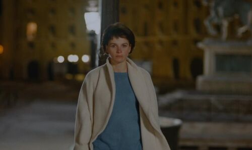 她用酒精浇灭了对旧情人最后一丝念想,但同时酒精似乎也让她忘记了烟花之夜与Alex的纵情狂舞,以至于第二天在看到未署名的告白留言后依然冷漠地打发了匆匆赶来的Alex。Alex失落地游走在街头,却给了Hans“可乘之机”。于是就有了全片最长的一段两人对话戏(长达五分半钟),Michele倾吐了自己的困境(无法看画),Hans则先为她展示了解决困境的方案(博物馆钥匙),随后分享了自己与已故前妻的故事,并说出了那句至关重要的话:“她有点像你”。至此,Michele脑海中的疑团终于正式成形:未署名的告白留言究竟是Alex写下的,还是Hans?从全景镜头中的站位能看出,Michele显然更愿意相信是Hans留的言,或者说她更希望自己是被Hans爱着的,因为无论从她当下的情感诉求还是对绘画的执念来看,Hans都是更好的选择,但现实却并不如Michele所愿。