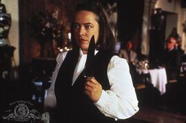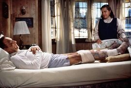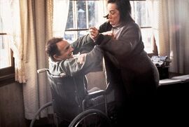 此片中楼梯和打头大量出现,大家注意到了吗?老警察背后中枪后,跌倒在楼梯上;作家试图用打字机打安妮的头,最后安妮也是被金属制的猪塑像砸死。可以说是报应。