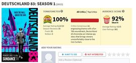 「德国八三年」由德国RTL和美国AMC联合制作,于2015年6月首播,是第一部在美国有线电视台播放的德语电视剧,之后又相继在英国、澳大利亚、荷兰等国上映。本剧获得了极高的评价,烂番茄甚至给出100%的新鲜度,因此成为烂番茄2015年度Top 10 TV show榜单中唯一一部非英语电视剧。