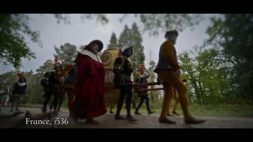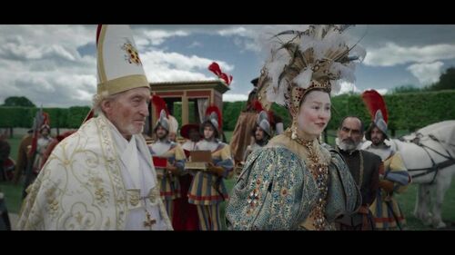 编剧肯定对法国国王弗朗索瓦一世完全不了解,所以让他这样蹩脚地欢迎意大利人到来。然而实际上,弗朗索瓦的母亲萨伏依的路易丝就是意大利人,所以他能流利地说意大利语,且对意大利文化和时尚极其热衷。这也是后来凯瑟琳能在宫中立足的另一个原因。顺便一提,历史上这时候弗朗索瓦一世才四十左右,演员都六十多了。教皇也是四十来岁,演员奔八......