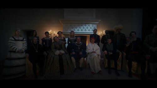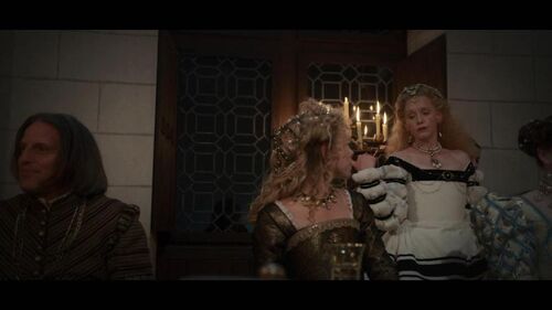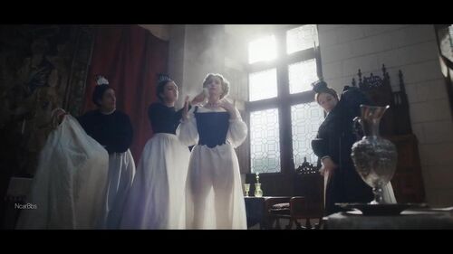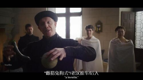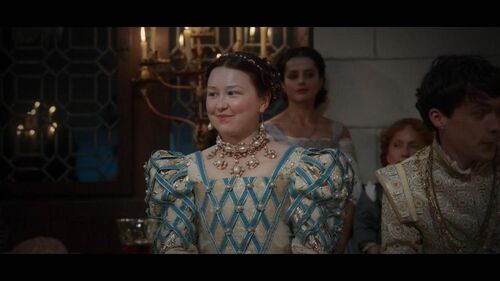 晚上的圆房。我们都听说过古代欧洲王室、贵族会有观看圆房的习俗,但实际上其中很多细节是被严重夸大的。首先床都是有床帘的,而且一般圆房时只会有少数至亲与仆人在帘子外等候,准备看看床单什么的,以确保顺利,不可能不挂帘子还全宫廷甚至外客都在观摩。大家想看比较准确的圆房现场,可以去瞅瞅法国电影《蒙庞西耶王妃》。而且实际上连这都未必是硬性要求,否则阿拉贡的凯瑟琳和亚瑟王子到底有没有做也不会是个历史谜团了。现实情况是,只有弗朗索瓦一世自己坚持要求待在洞房里,最后出去告诉大家两个孩子“战斗勇猛”。这一点是被史料特意提及的,也说明即便在当时的人眼中,他这个做法也让人不大舒服。而编剧如此夸大这一点,可能是不了解、想要荒诞喜剧感、迎合现代人猎奇心态等诸多原因共同作用。