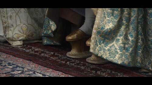 凯瑟琳的高底鞋引起了法国宫廷的好奇,尤其埃莉诺王后一脸地铁老头看手机的表情直接出声发问。但是,其他所有人都可以对此迷惑,唯独埃莉诺不应该。因为她在嫁到法国之前的十多年中都生活在西班牙和葡萄牙(她是前葡萄牙王后),而伊比利亚地区是最流行高底鞋的地方,所以她对高底鞋完全不会陌生。顺便一提,设计师显然不知道高底鞋不应该直接上脚穿,而是先穿平跟鞋再套上的。