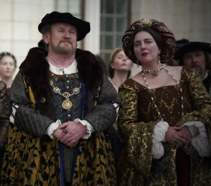 当然你不能指望设计师把女装也做对,凯瑟琳穿着这种束腰和臀垫就全是错的。虽然此时确实已经出现某种塑形衬衣,但并不是这种到1577年才有记录的后期束腰(尤其1530年代女装是讲究蓬松丰润的,压根不会束腰)。至于臀垫那更是后来的东西了。