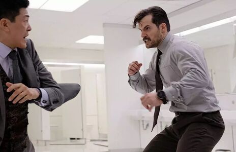 有几个进来上厕所的小青年,以为隔间里正在上演四脚兽的传说,跑过去表示他们也想加入,人越多越开心。好不容易把他们撵走,Lark也醒了,双方又打了起来。全片的肉搏戏以厕所这段最佳,尤其是反派拔下水管子当武器这一点,充分做到了因地制宜。