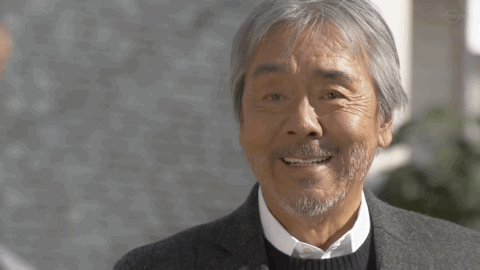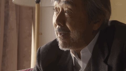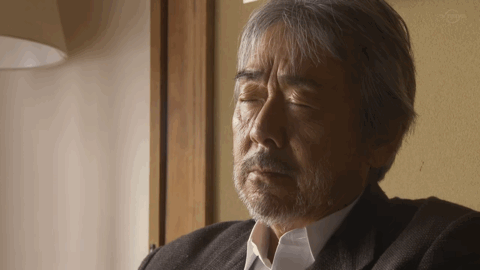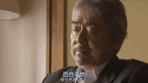 当然,真正能让本片立住的,是饰演父亲的寺尾聪的表演。当他偷偷向女婿打听女儿为何回家的真相时,女婿要求他保密。寺尾聪选择了闭眼,这个表情非常精准地把握住了人物的直觉,镜头也非常自信地停留在他脸上很久: