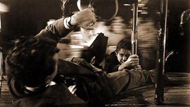 纷乱分岔的铁轨于火车轨道之上推进的插入镜头则预示了主人公充满艰难险阻的前途。镜头首先呈现出一条笔直向前的铁轨,随着镜头的前推,一道分岔映入眼帘。火车渐次偏离原轨,驶入通往银幕右侧的分轨道上(与布鲁诺的方向和位置相符)。紧接着,轨道变得愈加繁复杂乱,仿若蛛网迷宫。这一镜头在此彰显出了盖伊身为职业运动员所处的自给自足、单一的纯粹世界突然为一个精神狂乱的局外人侵入、破进后的混沌状态。