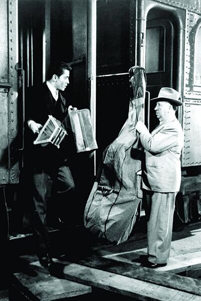 盖伊发球时压迫性的构图话分两头,在盖伊意外丢掉一盘后,第四盘比赛的竞争态势由于布鲁诺乘车赶往案发地点的平行叙事线而更趋白热化。希区柯克让布鲁诺持有的打火机意外掉入下水道,从而给盖伊赢来喘息之机。此后,盖伊力求速胜的比赛与布鲁诺努力捡拾火机的场景来回切换。平行剪辑的速度不断加快,故事节奏也渐次迅疾起来。为了延长这一冲刺性高潮,影片扩展了网球比赛的时间,在主裁、解说员与观众席上的安妮间多次切换,观者也得以充分享受到疾驰猛进的快感。最终的高潮来自失控的旋转木马戏,本段落之所以惊心动魄,主要归功于实景拍摄,而在疯狂木马底下爬行的人并非演员或特技人,而是货真价实的旋转木马操作员,当时他与致命的危险近在咫尺。希区柯克将此次拍摄经历称为其电影生涯中最惊险的瞬间。木马爆裂崩塌的镜头则紧接在实拍之后,是以微缩模型爆破和演员的背景投影合成拍摄。尾声一幕,劫后余生的盖伊与安妮在回程的火车上依偎私语,一个阅读《体育画报》的乘客认出了这位网球运动员,两人随即起身离去。是为首尾呼应——不要随便和陌生人说话,以免招惹是非。笔者认为,这一收尾不疾不徐,恰到好处。但在品评《火车怪客》的悬疑手法与形式镜语之余,相信影迷读者们也会不由自主地想及不少希区柯克其他电影(如:《深闺疑云》(1941)、《擒凶记》(1956)、《辣手摧花》(1943)、《迷魂记》(1958)等)中那稍显仓促的结局。这些戛然而止的结尾时常让人感到意犹未尽,也成为了希式标志性手法之一。二.希式母题与核心意象希区柯克也正是凭借其作品中种种异彩纷呈的签名式印记,成为“作者论”影评人们津津乐道的掌上明珠。一如《精神病患者》(1960)的编剧约瑟夫•斯蒂凡诺(Joseph Stefano)所言:“希区柯克将大部分自己喜爱的事物都拍进了电影中,这也是它们如此令人难忘的原因,他不仅仅是拍它们,而是用自己的全部热情将它们浸灌(infuse)入电影中。”[5] 《火车怪客》便是一部几乎囊括了所有希式意象与母题的作品。最为世人所熟知的、一个几乎出现在所有希区柯克作品中的“个人签名”当属导演本人的客串出镜。在本片中,盖伊在甩脱布鲁诺后走下火车,与一个拿着大提琴包的胖子打了个照面,他便是希区柯克。