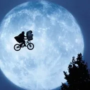 那一夜,艾里奥特骑着他的小脚踏车,载着E.T.从树梢飞过。天空蓝得近乎奇异,背景里有硕大浑圆金黄明媚的月亮,还有繁星满天,风声潇潇。艾里奥特的衣摆在风中飞扬。我看不到他们脸上的表情,却分明听到清脆笑声自耳边响起。