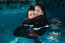 诸如此类的细节的编排都非常加分。些微有一些异议的是,第七集的浴缸戏的配乐其实有一些减分,导演可能有意想要降低情欲的部分,所以在这个名场面里使用了Bossa nova版的主题曲,确实有些过于爵士感了。但如果留意演员的表演的话,可以看到整个过程中Khum Sam都是“醉翁之意不在酒”的表情,你知道她脑子里想的是什么,你也知道她将要做什么,但音乐是反着来的。我相信拍这场戏的时候,导演讲戏时给演员构建的情景肯定不是这首歌所表达的氛围,否则Freen不会是这个表演状态。但凡换一个暧昧一些的音乐,整段戏的氛围感会更好。