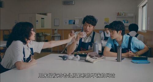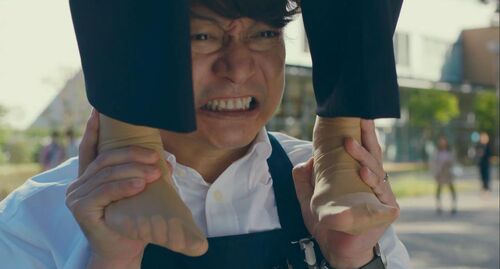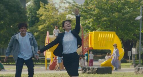 这就是最动容的场景之二,白色塑料袋挂在树梢,他们喘着粗气仰望着未来,田村蹲下,他主动负重,日和毫不犹豫地跨上他的肩膀,可是高度还是不够,她脱下高跟鞋,田村吃力地将她双脚举起,她站起来了,在他的双掌上。她伸出手,白色的塑料袋唾手可得,幸福就在眼前。他们成功了!