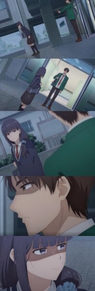 但是到了动画里呈现出来的是,明明群堂为了这两个青梅竹马的好友刚刚去找了黄毛做澄清让他不要瞎猜,随后发现男主站在这里没带伞明显是在等女主小智,所以群堂问他,意思是如果小智找别的男朋友的话...
