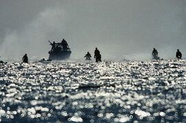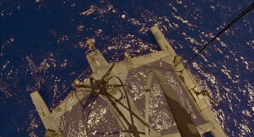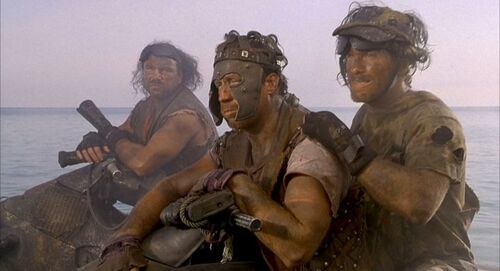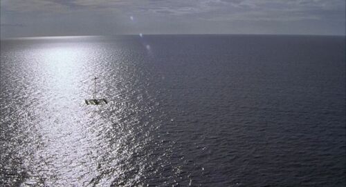 接着就是航拍交代环境,一望无垠的海面上,就一艘奇怪的小船。当年在电影院,这个镜头是非常震惊的。