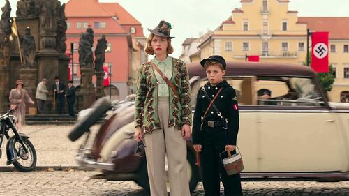 整部《乔乔兔》跟随着乔乔的视角,展现一个二战尾声期的德国,战败将近但几乎所有人都还沉浸在非理性的集体狂欢中,纳粹军服像《月升王国》的童子军装带着韦斯·安德森式的鲜艳,所有大人都变成了孩子一样滑稽而盲目的希特勒信徒,而所有孩子都是满口政治的愤怒战争机器。