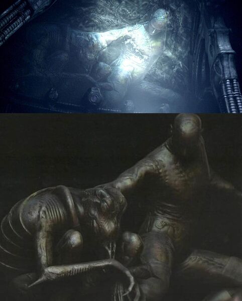 先一个个说,异形壁画,房间的上方壁画如图,一个工程师按住一个另一个被感染的工程师,他们在互相抵触,这有点像古典油画时期两军对抗的油画。