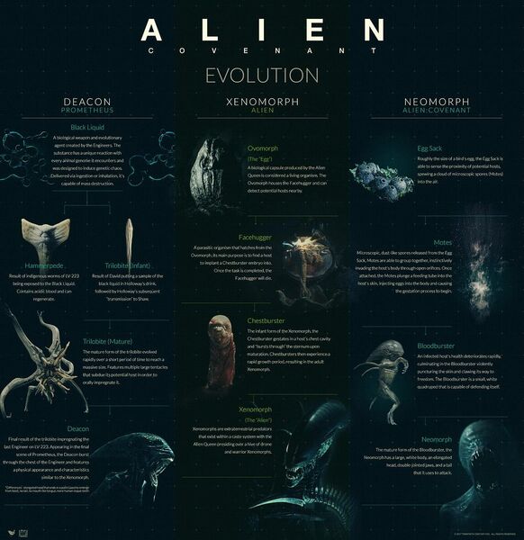 在《普罗米修斯》中,黑水通过人类不小心的释放而溢出,和“蚯蚓”结合,变成了蝴蝶蛇,而后攻击了一名人类科学家,科学家变异成怪物。