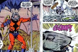 首次冒险当斯科特第一次穿上蚁人制服时,他在浴缸里被水流冲走,随后又遇到了老鼠,这与漫画Marvel Presents第11期的情节相似。