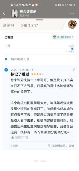 人生第一次豆瓣修改评分,送给《兄台请留步》四星改一星,虽然这部剧豆瓣评分根本人少的都没有开分,但是我也要评论表达我的态度。这剧我去年是完整看完的,一部真相只值得一两分的难看的小破剧。我去年违心的给了4分的高分,违心的写了好评,违心的贡献了一共10几个剧评,50几个讨论中的中的1个,帮忙转了我的朋友圈,因为我觉得努力追梦的演员哪怕是再小点的个体也值得支持一次。我觉得这是一个挺棒的小演员不怨环境,而是自己想办法自己开剧本的案例,所以我给了情怀的高分。但是万万没想到,竟然有今天的走向:自己剧因为内容踩红线要整改,就造谣别人的剧吃绝户??当初你们拍摄耽改,难道不是冲着暧昧让腐女买单吸粉的吗?你们也拍了大尺度,没火而已!别人拍了,火了而已,你们如果过了,后面的整改算不算你们吃绝户?所有的问题一杆子赖在别人的身上,真是极品。就这样吧。写这么多是这给我自己留念的,留念我去年竟然花了一周看了一部这样剧情老套,服化造垃圾,演员丑的小“情怀”网剧,没想到现在连情怀都是假的。---------------------以下是2020年的剧评想来评分支持一下小哥哥,但是按了几下实在打不下去五星,四星真的是注水加情怀给高分的极限了。这个剧核心问题就是太穷,这几年观众被优良服化道养的有点叼了,乍然看小成本虐的有点看不下去,但是忍过两集习惯了还是挺吸引人看下去的,剧情内容确实还可以,能感觉出来主创主演是想拍好剧的,我估计会追完,很神奇 ,给个加鼓励分的四分吧~