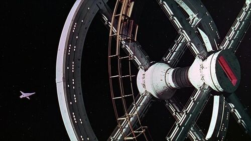 什么叫上帝视角镜头?我贴一张2001的图就明白了:这就是上帝视角镜头。我们看电影的时候往往会忘记摄像机的存在,仿佛摄像机(也就是观众的眼睛)是一个隐形的上帝,漂浮在空中。在太空中这就存在一个问题:如果我们要拍摄一个简单的,飞行器从屏幕左边飞到屏幕右边的镜头,那么摄像机本身的存在是在哪里呢?