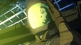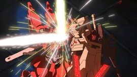 在里歇尔1牵制射击的同时,里歇尔2与杰刚,迂回至敌机体死角。敌机体开挂,放弃原本射击里歇尔1的打算,挥手盲射,命中杰刚盾牌并爆炸。当然,这种死角攻击模式虽然有效但是也相当容易预料……里歇尔2与杰刚冲出烟幕,接近至最近距离后,杰刚离开里歇尔2并暂时脱离,里歇尔在变型为MS形态的同时熄灭推进器,放出大量伪装气球,干扰了敌机驾驶员的视野及机体传感器。乘着敌机试图驱离伪装气球的空当,里歇尔2再次从背后以光剑发起攻击。敌机再次开挂,单手接住,并以高出力反向破坏了里歇尔2的右手臂。里歇尔2以绝佳的应变立刻左手持光束步枪抵住敌机头部击发。敌机再次开挂闪过,扯下里歇尔2的整支右手臂,并将其撞开撞开。里歇尔2退出战斗。