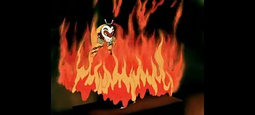 此处的剧情借鉴了《西游记》里孙悟空大闹天宫后被处刑的片段。