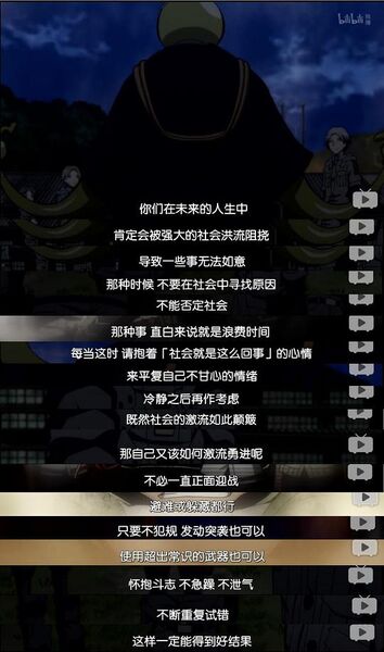 从一开始一集一鸡汤的帮E班吊车尾们纠正人生观,让大家在集体的暗杀中懂得扬长避短、齐心协力、耐心、毅力、对抗情绪、察言观色和最重要的,认识并认可自己。每个人在成长中,不仅让自己变成各种意义上的【好学生】,也让自己和周围人的关系变得不一样。而此时,力量足以颠覆这个社会的杀老师却说:“如果碰到难以忍受的事情,无论怎样都千万不能否定这个社会。要学会对自己说:就是这样了啊,这个社会。平复了心情之后开始思考,既然社会的洪流如此颠簸,那我该如何在其中前行呢。你们应该已经学会了,在这间暗杀教室,在这个E班,不用每次都从正面迎难而上,避避风头躲起来也没关系,只要不违反规则偷袭也可以,使用突破常规的武器也没关系。”