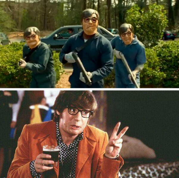 在电影中的第二次团伙抢劫中,道哥在开会的时候说要买《月光光心慌慌》系列电影中的杀人狂麦克尔·麦尔斯(Michael Myers)的面具,结果因为“Michael”与“Mike”发音易混淆,最后买来的是《王牌大贱谍》中主演麦克·麦尔斯(Mike Myers)的面具,这也变成了个搞笑梗,出现在抢劫前团伙互相吐槽的场景中。4 & 5、《怪兽大学》和“梅姨”,都是配角……