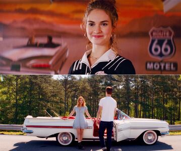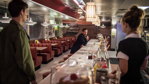 黛博拉跟“宝宝”刚认识时候就描述了这么一段:“我想开着一辆负担不起的复古豪车,一路向西没有目的地,只有音乐和路。”这是多么浪漫的畅(调)想(情),小姐姐应该也是位老司机。 而在黛博拉工作的餐厅墙壁上,挂着美国最著名的66号公路的牌子,这条最负盛名的“母亲路”从20世纪上半叶开始见证着美国历史,由芝加哥横跨美国大地一直通往洛杉矶,也是如《阿甘正传》 、《蓝莓之夜》 、《在路上》等佳片的电影取景地。 事实上,导演在写剧本之前,就给自己来了一次横跨美国的公路旅行,一个人自驾从纽约开到了洛杉矶,相信他也融入了不少当时旅途中的特别感受。所以在电影的“反高潮”结尾,这对儿亡命鸳鸯上演浪漫私奔可能从20号公路真想开上这条风光大道,但可惜还是事与愿违;在Baby被捕后,黛博拉邮寄给他的明信片中,就有一张来自66号公路沿途餐厅(Bo's Diner)的壁画;而在最后的最后,Baby出狱的那天,面前是开着一辆复古老爷车的黛博拉,或许这条象征自由与梦想的公路之旅也终将开始。