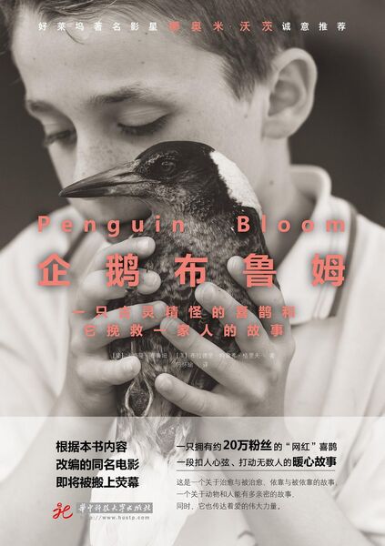 此时,受了伤的小喜鹊进入了他们的生活。全家悉心照料。康复后的小喜鹊仍旧不时回到布鲁姆家来,与孩子们玩耍、共眠,与萨姆亲近、相伴。因其毛色黑白相间,大家便叫“企鹅”,还为它冠以姓氏,从此小喜鹊便有了“Penguin Bloom”(企鹅·布鲁姆)这个大名。 因为救助它,萨姆再次感受到了被需要的感觉;“企鹅”克服伤痛、再次飞翔的勇气也给了她鼓励;而日复一日的亲密相处也将它的调皮可爱和双方之间的默契展露无遗。小喜鹊与这一家人,他们的治愈是相互的。
