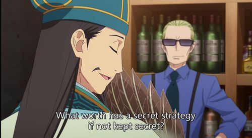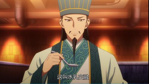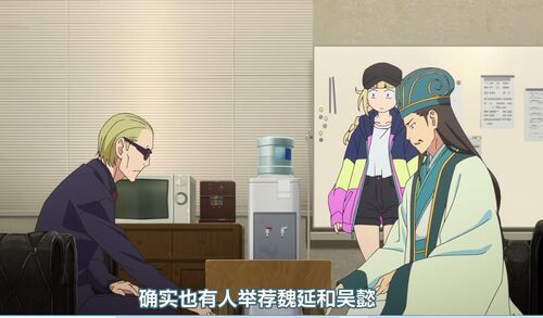 《三国志·魏书·李典传》 :刘表使刘备北侵,至叶,太祖遣典从夏侯敦拒之。备一旦烧屯去,敦率诸军追击之,典曰:“贼无故退,疑必有伏。南道窄狭,草木深,不可追也。”敦不听,与于禁追之,典留守。敦等果入贼伏里,战不利,典往救,备望见救至,军散退。12. 诸葛亮和酒吧老板下围棋。类似的情景在第一集面试的时候就有出现,不过当时棋盘上棋子较多不好确定谁是先手。动画两次的画面都是孔明白棋先行,应该是明确的暗示中国古代围棋白先黑后。