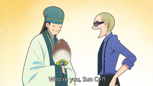 《三国演义·第六回》:傍有军士指曰:“殿南有五色豪光起于井中。”坚唤军士点起火把,下井打捞。捞起一妇人尸首,虽然日久,其尸不烂,宫样装束,项下带一锦囊。取开看时,内有朱红小匣,用金锁锁着。启视之,乃一玉玺:方圆四寸。上鑴五龙交纽;傍缺一角,以黄金镶之;上有篆文八字云:“受命于天,既寿永昌”。《三国演义·第十五回》: 三人计议已定。次日,策入见袁术,哭拜曰:“父雠不能报,今母舅吴璟,又为扬州刺史刘繇所逼;策老母家小,皆在曲阿,必将被害;策敢借雄兵数千,渡江救难省亲。恐明公不信,有亡父遗下玉玺,权为质当。”术闻有玉玺,取而视之,大喜曰:“吾非要你玉玺,今且权留在此。我借兵三千、马五百匹与你。平定之后,可速回来。你职位卑微,难掌大权。我表你为折冲校尉、殄寇将军,克日领兵便行。”在动画剧情里,英子的粉丝量明显无法保证音乐节的表演有充足观众,孔明不肯提前透露计策,老板便用“你是孙策吗”吐槽孔明难道要像孙策一样用玉玺换来兵马(招揽观众),孔明也是机智地回应了“我没有私藏玉玺”。