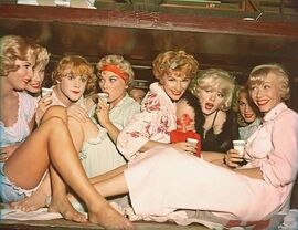 这就是为什么杰瑞在女性群体之中只会带来搞笑感,而非色情。只有杰瑞这个角色才能带动无性别的搞笑段落——在火车的通往佛罗里达的旅途中,一个精彩的、很少色情意味的肉体堆积段落——杰瑞躺在火车的卧铺上,他喃喃自语着:“I am a girl.”痛苦的睡去,这时候梦露扮演的甜甜出现了,和他肩并肩的躺着,杰瑞立刻手脚冰冷满头大汗。然后,他和梦露开始偷偷喝酒聊天,这时被别的女孩发现了,于是一个接一个的女孩爬进他的卧铺,她们穿着睡衣,露着胸和大腿,拿着酒杯和点心,把一截小小的卧铺塞的满满,进来的女孩越来越多,难以置信的一个小小的床铺能挤进如此多的人。杰瑞被牢牢的挤在中间,无助的大叫着,喊着:“13个女孩不是一个好数字!”在这里,性别更多的是作为调味剂,是无伤大雅的笑话,而没有肩负起真正的“性”的功能。岔开一句,在性的问题上,影片一直尝试用隐晦又新奇的方式表达。这种成熟事故的爱情关系,含蓄挑逗的性暗示一直出现在影片当中。比如梦露在亲吻乔的时候,躺在沙发上的乔的一只脚翘了起来。之后他又更加明显的追加了一句“我觉得好像有烤肉的小火在烤我的脚趾。”梦露说:“再扔一根木头进去吧。”——它用一种纯真的面貌表达色情和性感,就好像就好像玛丽莲.梦露的低胸晚礼服和无辜茫然的表情一般的组合在一起。