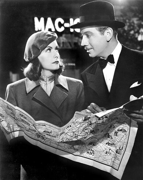 当故事进程被男女主人公的浪漫爱情所主导之后,比利怀特的台词魅力愈加闪光。不过,刘别谦仍然能够抓紧恰当时机巧妙地展示其的独树一帜的视觉风格。尼洛契卡与里奥在马路隔离带上第一次相遇。寒暄后,她拿出地图让对方指路,里奥瞅准机会以指路为由“骗”得对方的手指。当里奥拿着她的手指找“我们现在在哪”时,镜头没有保留在地图特写状态,而是切到正对两人的中景。持续几秒后,尼洛契卡慢慢抬起头,眉毛微挑,不屑且略带讽刺说:“我感兴趣的是两点之间的最短距离!”在这里,刘别谦再一次运用了“省略”。地图则起到了他所钟爱的门的作用。由于它的遮挡,观众看不到里奥怎么做的,但却完全可以通过尼洛契卡此时的表情和幽默含蓄的台词去想像到他是为了多摸摸女人的手,故意绕来绕去找不到目标。极为简单的一场戏,镜头、台词和演员表演配合的相当完美。令人拍案叫绝!