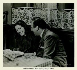 虽然影片中存在太多处具有强烈的意识形态情节,但是个人感觉,刘别谦并不想要刻意的讽刺或者丑化布尔什维克。至少不是影片所表现的重点。导演更需要的是借助这两种有着巨大差异文明的碰撞,来产生他所需要喜剧能量。因为,单纯的依靠嘉宝的冷艳和道格拉斯的火热的反差所产生的热量,很显然不足以维系这部长达110分钟的影片的喜剧温度。在影片结尾的那个镜头中,其中一个俄国佬挂着牌子,抗议餐厅私有化后其他两位“同志”对他歧视和不公。这似乎也表明了,刘别谦在有意通过对资本主义剥削本质的揭露,达到某种程度的政治立场上的平衡,从而让观众更能关注电影和喜剧本身。