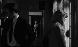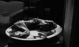 实际上,卡罗尔在精神逐渐失常的过程中,摄取的食物也越来越少。这从卡罗尔家中原封未动的一堆土豆与一盘兔肉即可看出。随着时间的推移,那堆土豆开始发芽、腐坏。这一意象在波兰斯基近40年后的作品《钢琴家》(2002)中重现——艾德里安•布洛迪饰演的男主人公被困在公寓里,断水断粮,翻出来一个严重霉变的土豆充饥,导致肝部肿大,高烧不退,险些丧命。至于渐渐变质、苍蝇丛生的那盘兔子,则不免令人想及大卫•林奇《橡皮头》(1977)里两个如噩梦般诡异的生物:在餐盘里蠕动的怪鸡和怪诞恶心的畸形婴儿。几乎可以肯定,林奇在一定程度上借鉴了本片。两部影片另一相似处是对性欲与性压抑矛盾的呈现,不过林奇的故事全然发生于一个离奇的、后工业社会的、宛如末日般的超现实世界中,这与本片的现实时空设置大相径庭。