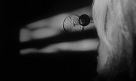 无处不在的裂缝与罅隙,在影片中被赋予了两层含义。首先,人行道上的裂缝与道路施工处于同一场景中,同片末卡洛儿头顶坍塌下来的天花板,均象征着卡罗尔精神世界的崩解与倾覆。除此之外,裂缝也喻指女性的阴道。我们很容易就能联想到另一部描摹女精神病患者的经典影片——英格玛•伯格曼的《犹在镜中》(1961)。女主角凯伦经常面对着墙上的裂缝,生发出虔诚的宗教臆想,而在影片的结尾,上帝终于对着她显现了——一只企图强奸她的蜘蛛。而本片中,幻想中强奸卡罗尔的男人,常常是从卧室的墙缝里现身的。无独有偶,卡罗尔坐在路边长凳上,神情恍惚地凝视着裂缝,而苦苦追求她的科林则直接一脚踩在裂缝上,遂构成一幅暗指两人发生性交的图景。此外,在影片中反复登场的剃刀也是精神分析中典型的男性性器官象征(考虑卡罗尔扔掉姐姐男友的剃刀一段),同理还包括割破皮肤的指甲刀,也不无性意味。需要说明的是,笔者对“凡符号分析皆论性”的批评策略是持反对态度的。但在本片的文本语境中,上述解读绝非牵强附会的过度阐释,在本片摄制完成的20世纪60年代中期,弗洛伊德精神分析学正大行其道,不论在艺术电影(如费里尼的《八部半》(1963)《朱丽叶与魔鬼》(1965))还是商业片(希区柯克的《精神病患者》(1960))中皆是如此,《冷血惊魂》亦不例外。另一列符号与食物有关(正所谓“食色性也”)。影片中,卡罗尔的同事曾详细描述“前日放映的一部爆笑的卓别林影片”(看过的观众肯定能猜出这是《淘金记》(1925)):卓别林因为过于饥饿,把鞋子当作牛排、鞋带当作意大利面吃掉了;同行的另一人则将卓别林看成了一只香喷喷的鸡,追着它跑。随即,同事在手提包里发现了一枚心脏。在本片的意义网络中,《淘金记》里食物引发的幻觉正好与卡罗尔因性欲引发的幻觉形成对位,这也是波兰斯基的又一个妙笔。