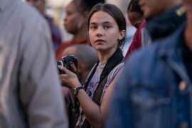 后面进入到公路片模式,每到一个故事节点,电影就会展现摄影的作用——看着一个个定格照片,观众心中自动会拟写好所谓的“图片说明”,成为一次新闻作品的共创。嘉兰借助定格照片,找到了电影与新闻摄影的通感方式,向观众提示媒介可能产生的力量。