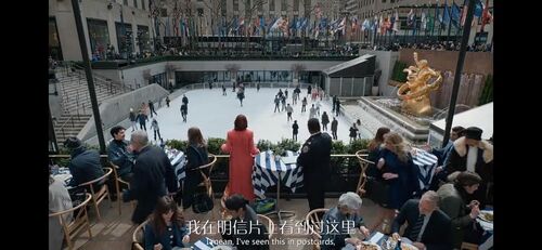 洛克菲勒街心花园:洛克菲勒中心是由14栋摩天高楼组成的建筑群。洛克菲勒中心的街心花园,在每年的10月到次年的4月,是室外溜冰场Rink——所以Elsbeth看到滑冰的人群,迫不及待地跟警长说,我们去滑冰吧!金色的雕像是拿着火种的普罗米修斯。花园周围还飘着各国国旗——这里曾经是联合国总部大楼。