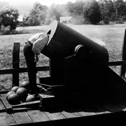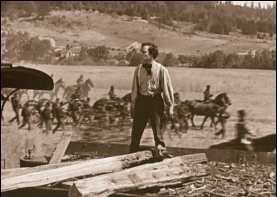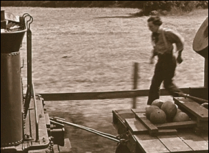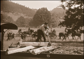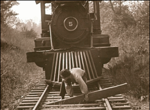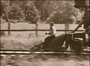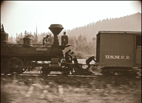 其中一幕是基顿为了给火车加速而奋力劈柴,他丝毫没有注意到身后浩浩荡荡行进的军队。