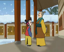而在动画片中,编剧为华佗演绎了一段曲折的拜师经历。动画片一开始,说华佗父母双亡,于是立志学医,给贫苦人看病。随后,华佗在一个名为“仙医镇”的地方,找到名医“蔡大夫”。蔡大夫说,要拜他为师,必须完成两道难题:一是不用梯子、不爬树,摘下树叶;二是分开两只打架的山羊。华佗在绳子上缠上石块,挂下一根树枝,轻松摘下叶子;他又给两只山羊分别喂草,成功使它们安静下来。