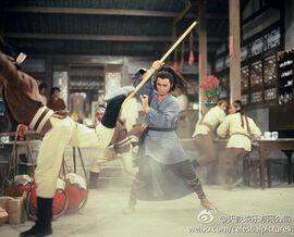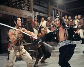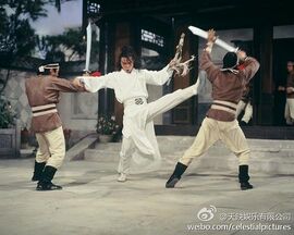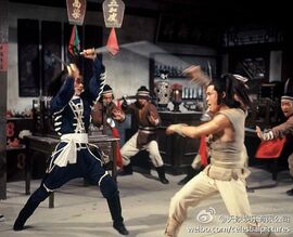 之后“轻功”不服气找罗莽单挑,偷袭不成反被灭了(这块有点扯,罗莽是聋哑人听不到有人偷袭就在前胸挂了面镜子,但“轻功”从后边袭来,罗莽却主动拿起镜子,让观众看见里边有个人影,再下杀手,很明显,张彻又图省事了。)