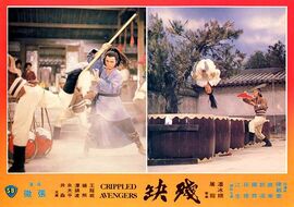 其实“硬功”也算个悲剧人物。电影里对他的描述没有太恶的地方,他在门前施舍过郭追,在庄园里教训过“轻功”,还与总管切磋过武功(就是把总管的武器流星锤弄断了,想帮忙总管去收拾几个残废才把命送了。他死前盘肠大战,死后屹立不倒,在张彻电影中只有英雄人物才有的戏份都给他了,也算张彻对此人物的喜爱吧)