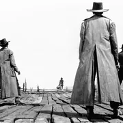 画面一转,爱尔兰人的荒地在吉尔——这个从东部发达地区迁来的长袖善舞的姑娘——的接管下,热火朝天地建起了火车站、教堂、学校、银行、百货店……很快一个全新的世界将崛起。应该承认,吉尔这个女人是没有是非观的,无论弗兰克和流浪枪手的决斗谁得胜,她都会伴着胜者。而这,就是接下来的资本主义原始积累阶段商人的性格特质:没有永远的朋友,也没有永远的敌人,只有永远的利益。面对她的挽留之情,流浪枪手毫不犹豫地转身离去。尽管不能捍卫自己生存的旧世界,但最起码他获得了一个体面的退场。在他孤寂的身影之后,老西部的厚重铁门在历史的绞链用力下缓缓地合上。