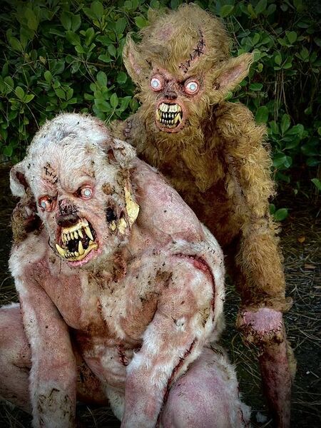 在一个黑暗、令人毛骨悚然的地下室里,一个血淋淋的女人耐心地坐在一个动物箱里,她的下巴像斗牛犬一样。在她旁边,一个脸上有抓痕、爪子毛茸茸的男人穿着内衣躺在医院的轮床上。手术工具和颌骨散落在不锈钢医疗托盘上。在房间的后面,通过一组工业塑料门板,两个可怕的人狗生物在谈论午餐吃什么。