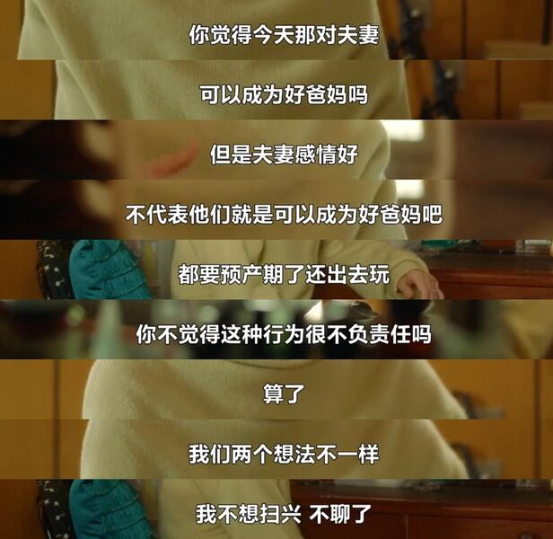 最后的最后,男方在回避,在挽留,脑中还存有美好的一家四口的愿景,在尝试继续承诺,女方再次,开口做那个成熟的啰嗦的坏人。她知道这不是他们两个人的事,不是他们两个人就能走过去的事。